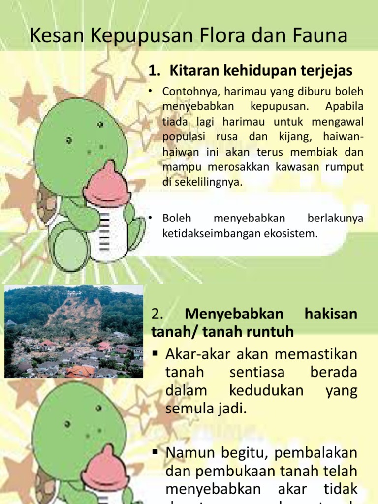 Kegiatan ekonomi seperti penerokan hutan dan perindustrian yang tidak dikawal boleh menyebabkan tumbuh-tumbuhanhaiwan liar dan hidupan dalam air pupus. Kepupusan Flora dan Fauna 4- MEWUJUDKAN HUTAN SIMPAN langkah-langkah memelihara dan memulihara FLORA 5- MENGUATKUASAKAN UNDANG-UNDANG BERMAKSUD. Published on May 5 2015.